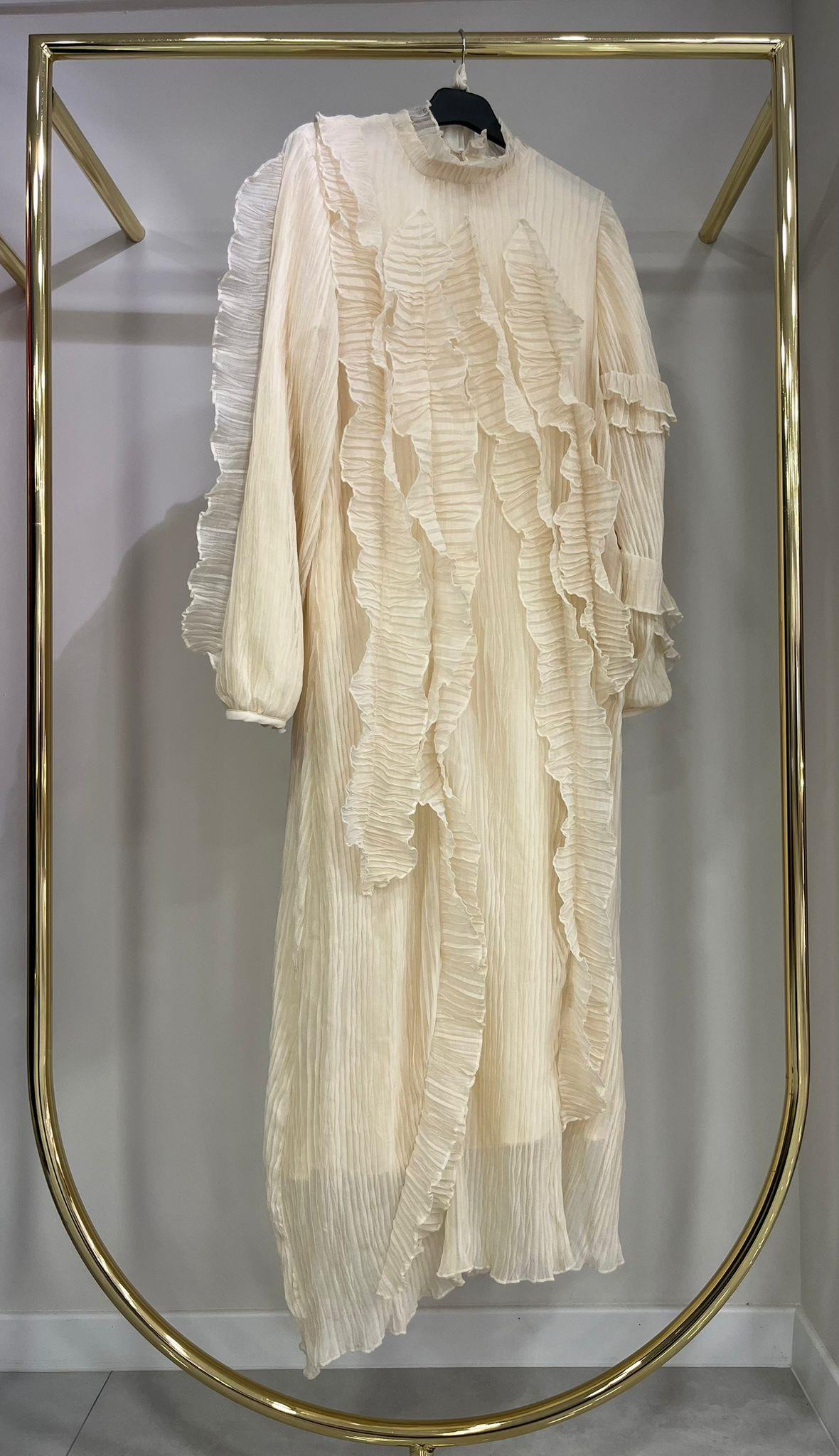 İthal Akerdiyon Pliseli Krem Abiye Elbise
