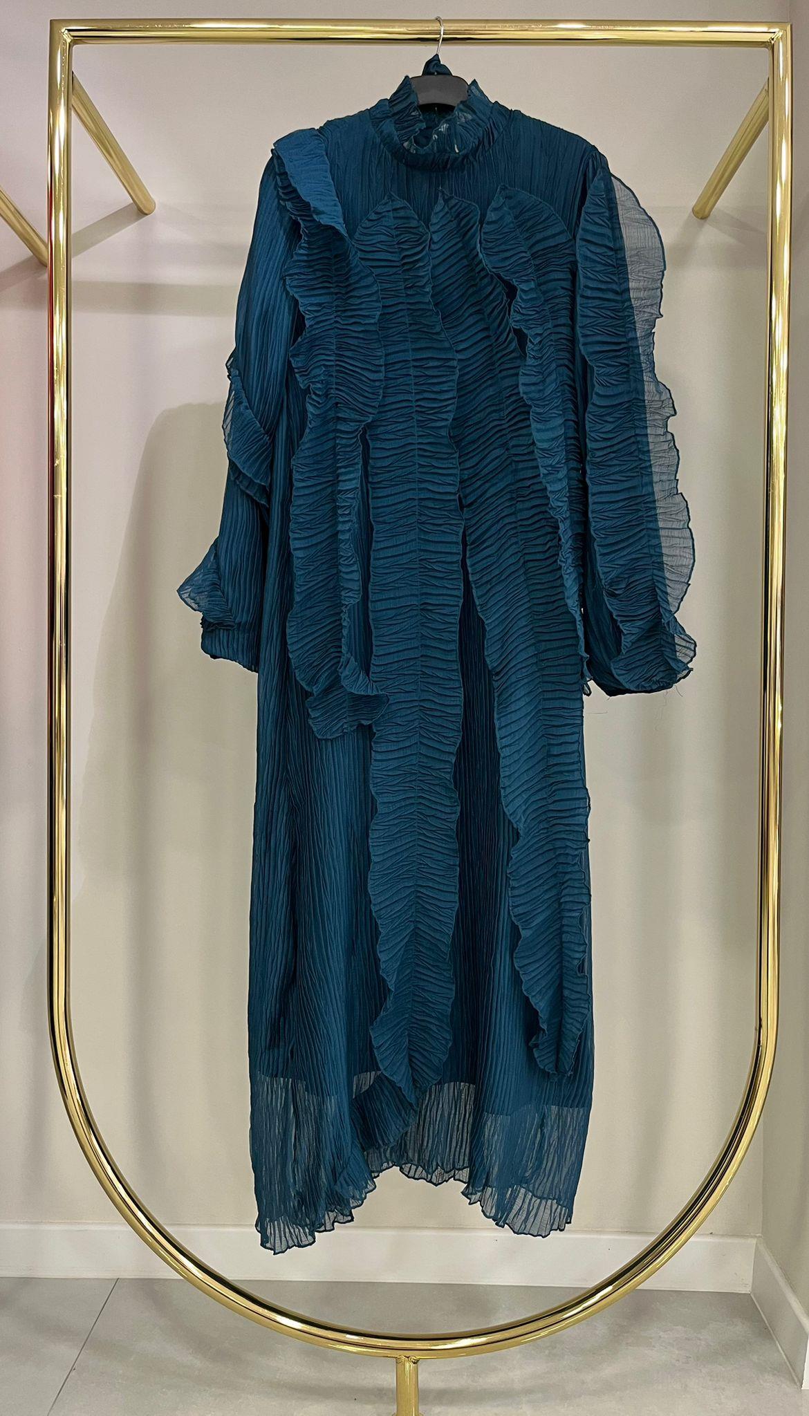 İthal Akerdiyon Pliseli Petrol Mavisi Abiye Elbise
