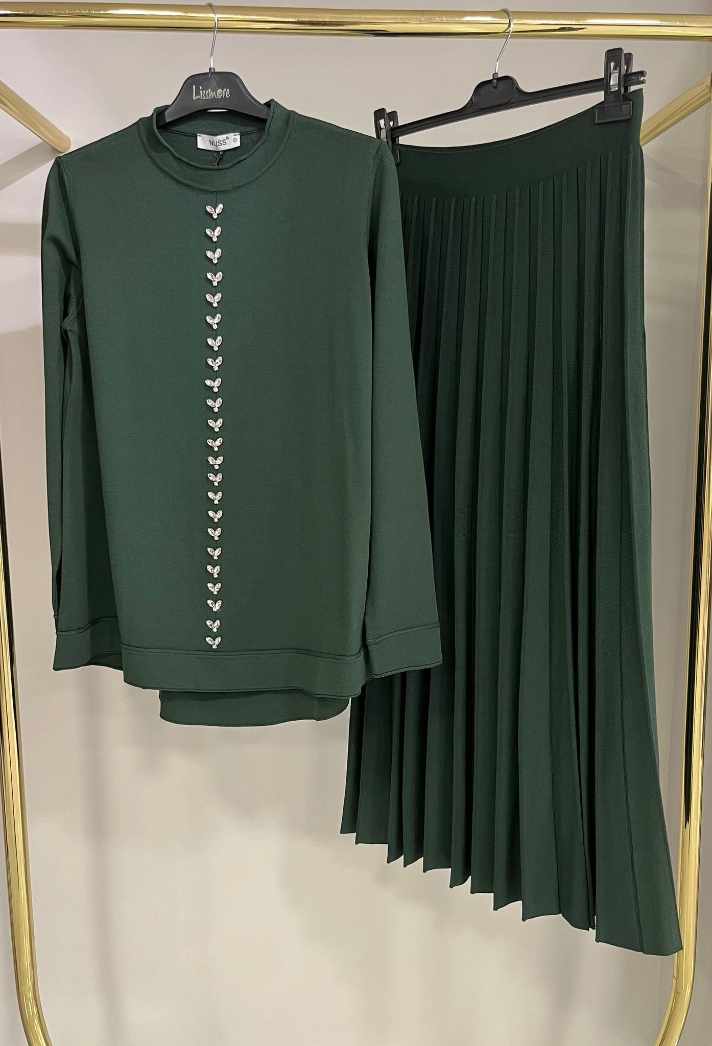 Nuss Taş Detaylı Çam Yeşili Etekli Takım