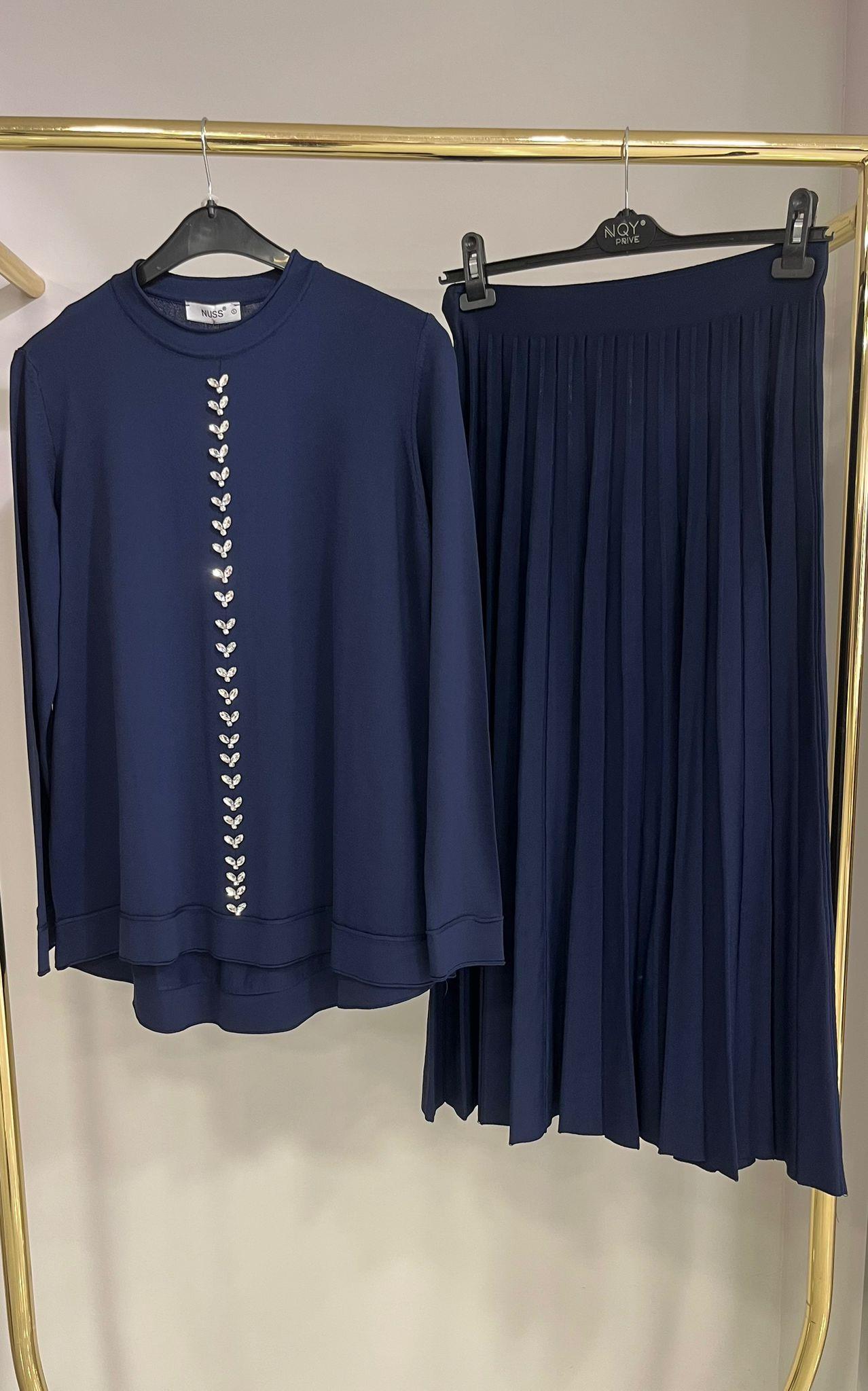 Nuss Taş Detaylı Lacivert Etekli Takım